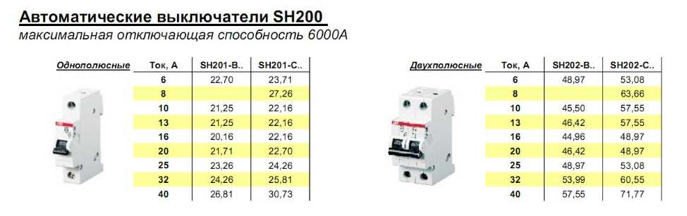Чтобы упростить выбор защитного автомата и избавить вас от необходимости браться за калькулятор, приведем таблицу, в которой указаны номиналы АВ, которые включаются в однофазные и трехфазные сети, и соответствующие им мощности суммарной нагрузки.