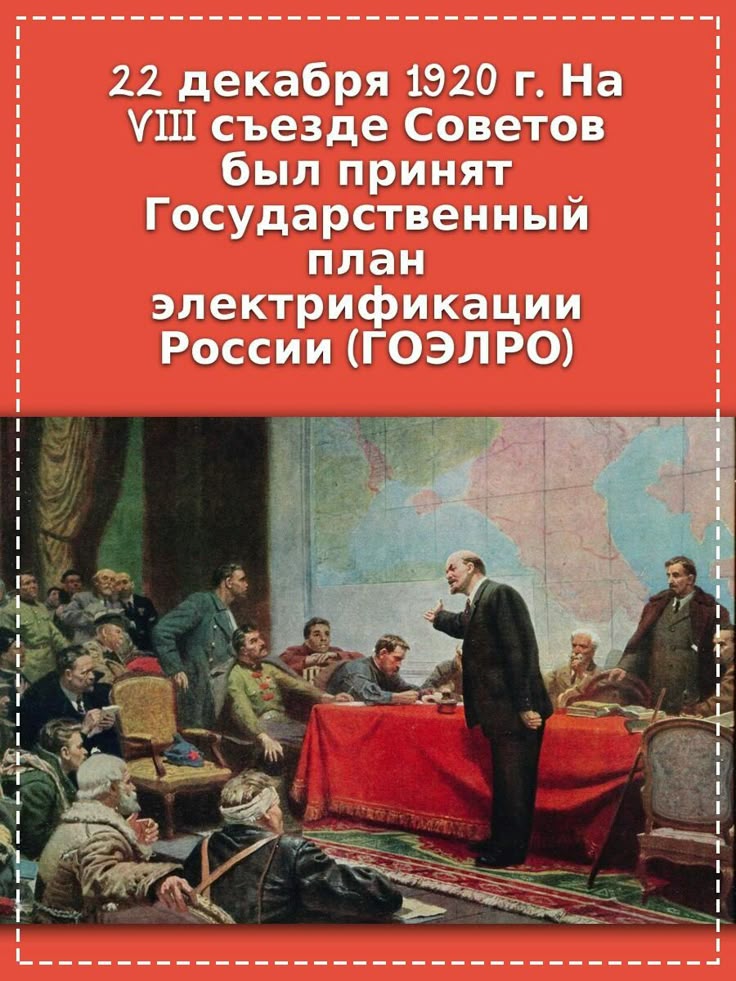 22 декабря 1920 года на VIII Всероссийском съезде Советов был принят Государственный план электрификации России (ГОЭЛРО). Он разрабатывался по личной инициативе Владимира Ленина.