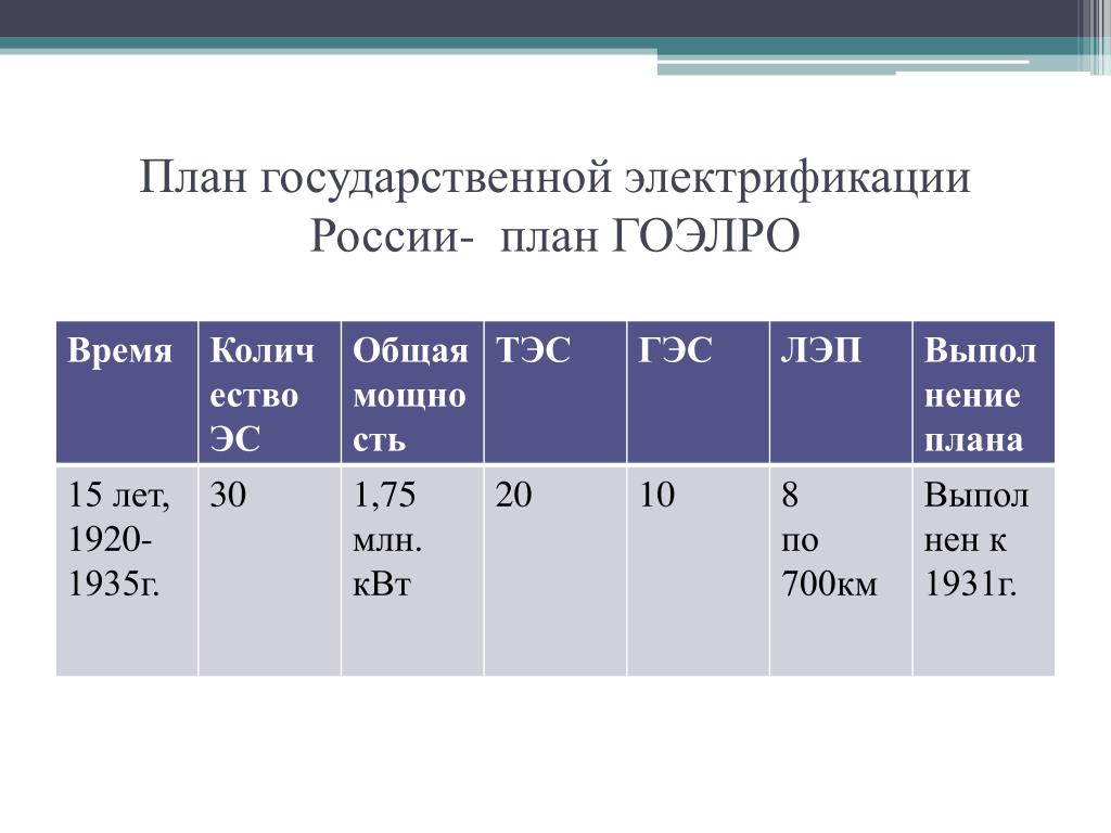 Главной целью плана стало восстановление и дальнейшее развитие электроэнергетики страны, а вместе с тем – и развитие промышленности и сельского хозяйства в государственных масштабах.