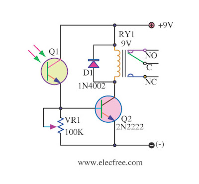 - Сумеречные реле. Их еще называют фотореле – это устройства для автоматического включения света в темное время суток. На схеме ниже изображен простейший вариант такой схемы, на аналоговых компонентах и электромеханического реле. Её недостатком является отсутствие гистерезиса и возможное возникновение дребезжание при приграничных величинах освещенности, в результате чего реле будет дребезжать или включаться-отключаться при незначительных колебаниях освещенности.