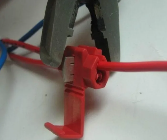 Обратите внимание на то, чтобы провода в разъеме попали между зубчиков контактной гребенки, она присутствуют в любом из исполнений. Изоляция с проводов не снимается, в последствии она перережится гребенкой и через нее будет образован контакт. Вам необходимо лишь надавить пассатижами, чтобы прорезать изоляцию и обеспечить контакт с токопроводящей частью кабеля и гребенки в зажиме.