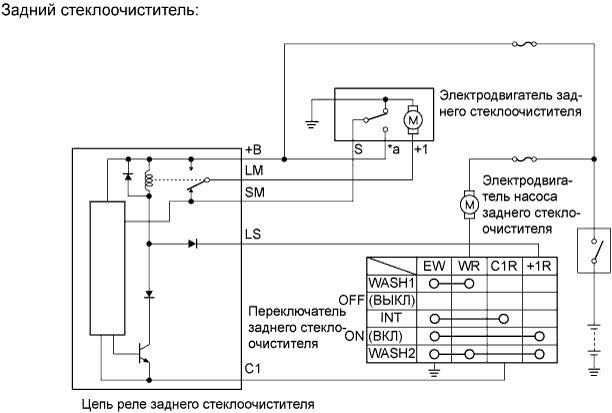 Моторедуктор стеклоочистителя имеет три режима работы, они включаются правым подрулевым переключателем. Прерывистый режим обеспечивается электронным реле К2 типа , установленным в монтажном блоке. Это реле также включает малую скорость моторедуктора очистителя при включении омывателя ветрового стекла. При работе моторедуктора на малой скорости в постоянном режиме напряжение питания подводится к диаметрально противоположным щеткам. Для разгрузки контактов выключателя зажигания электродвигатель подключен через дополнительное реле Кб в монтажном блоке.
