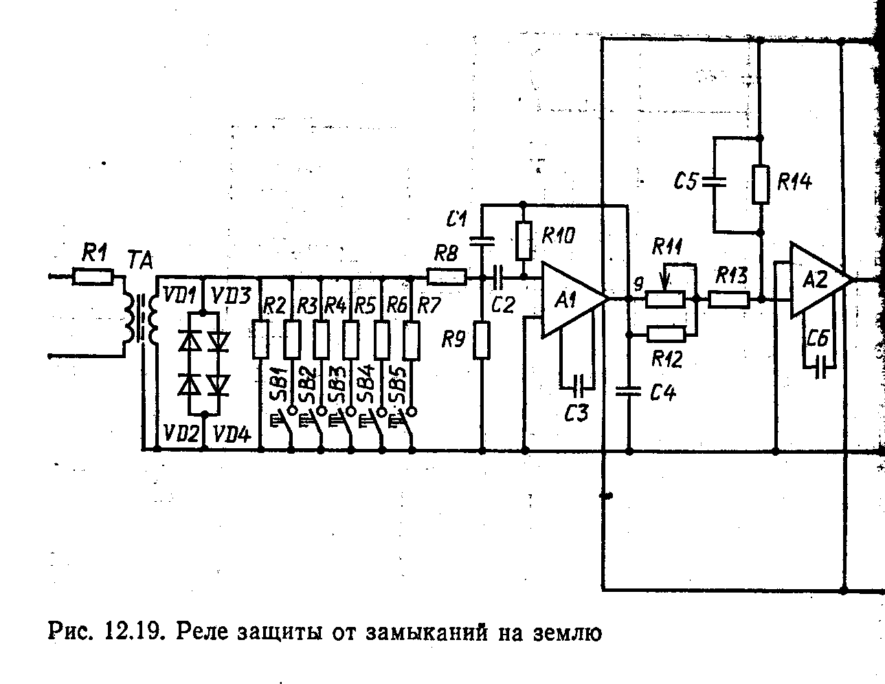 Схема реле представлена на рис. 9.3.6.Измерительный орган реле содержит промежуточный трансформатор ТА и резисторы R2—R7, которые вместе с выключателями SB1—SB5 служат для дискретной регулировки тока срабатывания. При отключенных выключателях ток срабатывания реле минимален. По мере включения R3—R7 уменьшается напряжение на выходе операционного усилителя А1 и ток срабатывания увеличивается. .Диоды VD1—VD4 служат для ограничения сигнала на входе А1. При большом входном сигнале