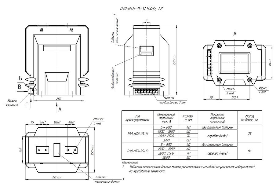 Трансформаторы выпускаются с одной вторичной обмоткой для измерения и одной вторичной обмоткой для защиты. Трансформаторы на номинальный ток 1000 и 1500 А могут выпускаться с двумя вторичными обмотками для защиты.
